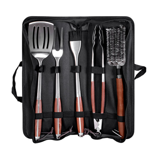 Professional Stainless Steel Grill Utensils Set with Wooden Handle (6 Pieces)